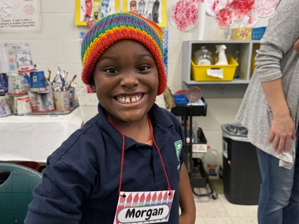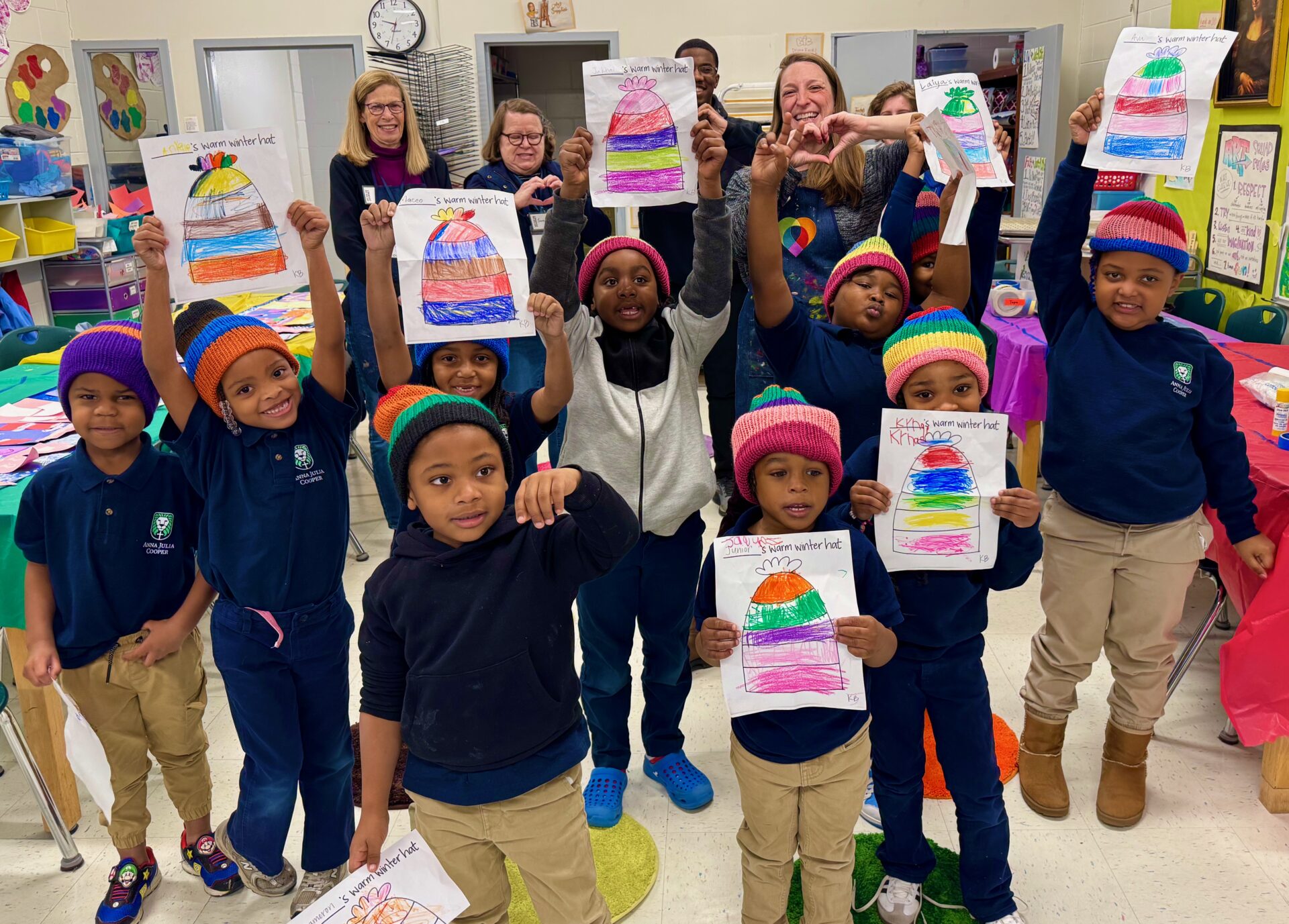 Last winter, on one of the coldest days, these students from Anna Julia Cooper recieved the hats they designed themselves in art class, where a “secret knitter” replicated them and sent them for each student to have. Volunteers like Lisa McLaughlin, the secret knitter, make the work we do a joy, and engage humans of all ages to connect, support, create, with the sense of well-being and flourishing for all involved. Today, Art for the Journey has more than 500 volunteers on their roster, many of whom are unseen, but compassionate, energetic and talented like Lisa! The grant funding we’ve received from the VCA not only helps us impact lives of children, adults, veterans and older adults, it also engages volunteers in beautiful and meaningful ways.
