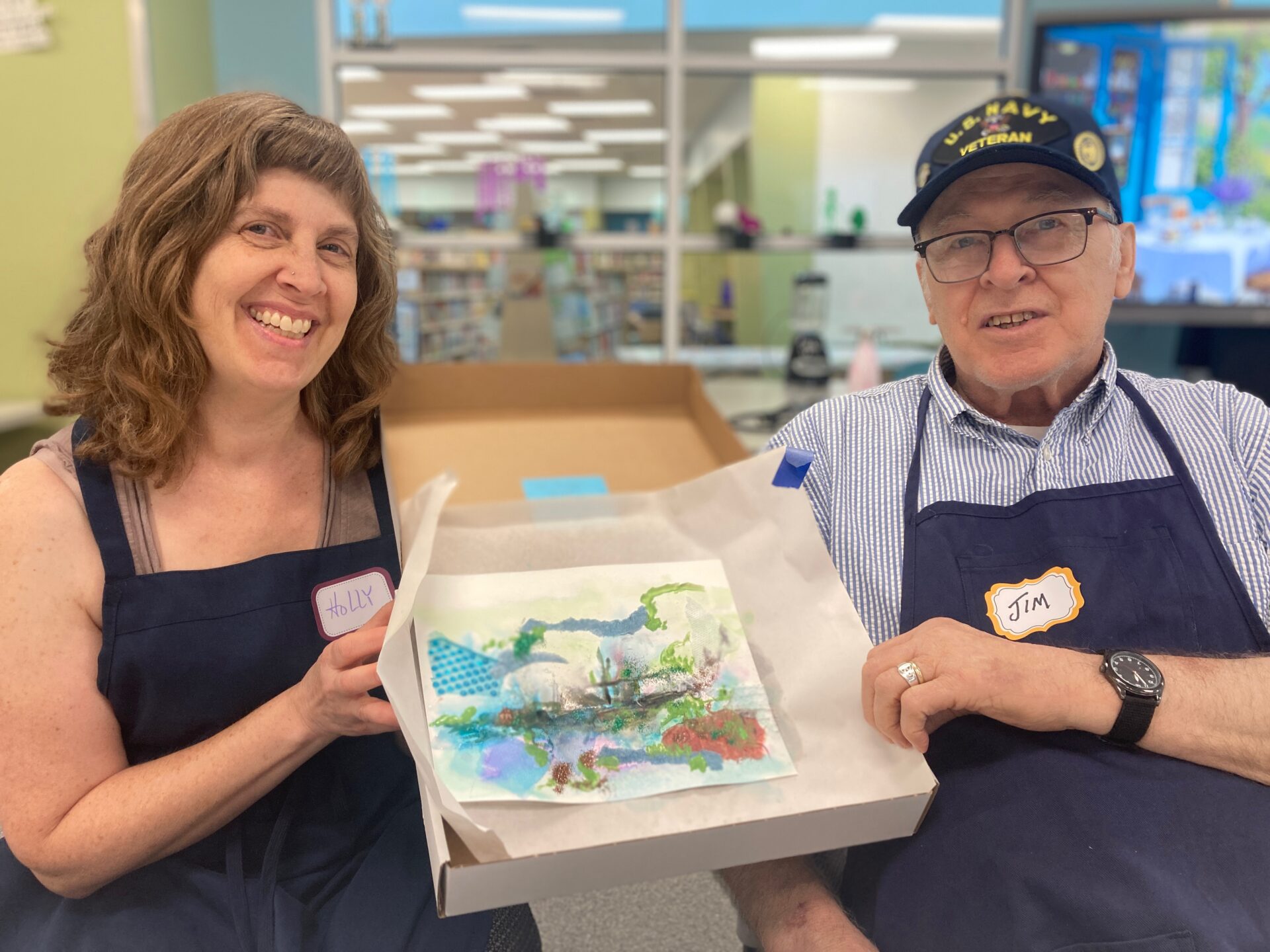 The expansion now reaches beyond assisted living, and through art agencies and libraries there are locations where people who live at home can find an OMA program in the Richmond area. Early in our training, we recruited trainees from the Cultural Arts Center of Glen Allen. CACGA quickly became champions of OMA, and have an OMA center in their center partnering with the Alzheimer’s Association, and serving caregivers of people living witih dementia.