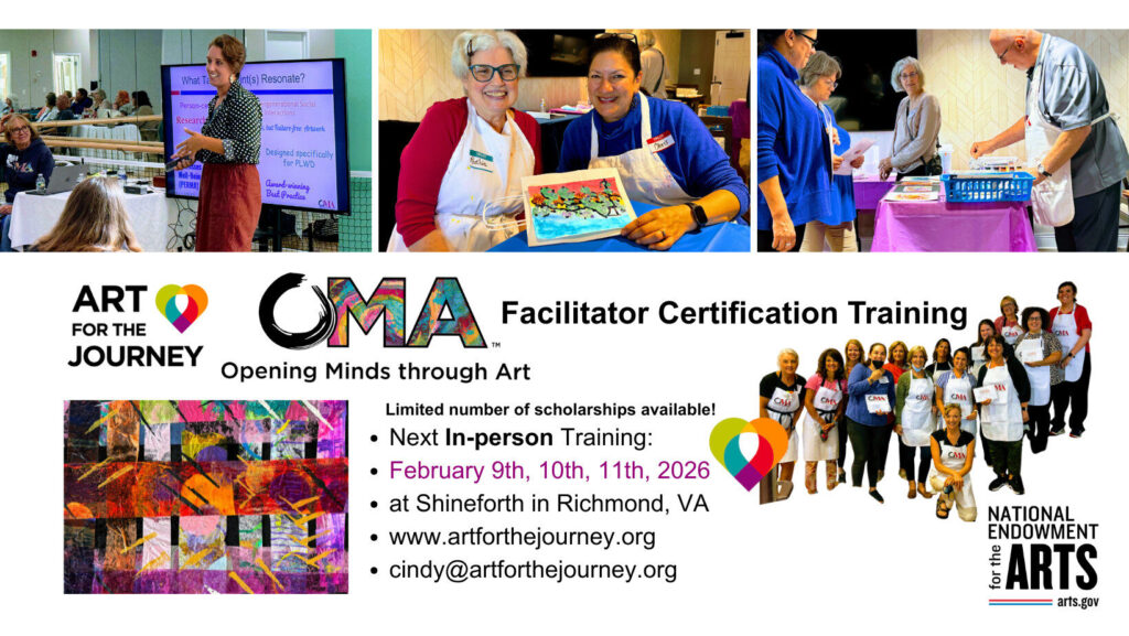 Thank you to the National Endowment for the Arts, and the Alzheimers Foundation of America, for supporting in part, the Art for the Journey OMA Facilitator Training helping us foster great and positive impact for many.